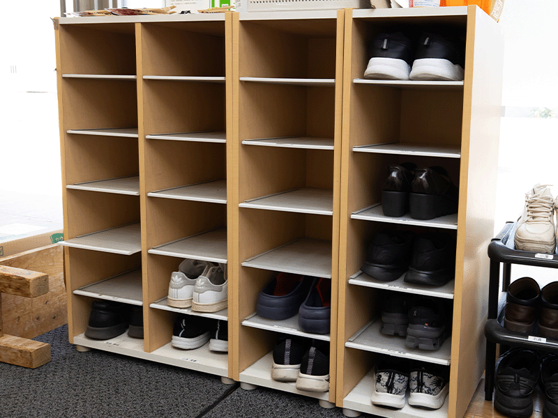 一人ひとり入れることのできる靴箱を用意しています。お名前も見える場所にあるため、取り間違いを防ぐことができます。