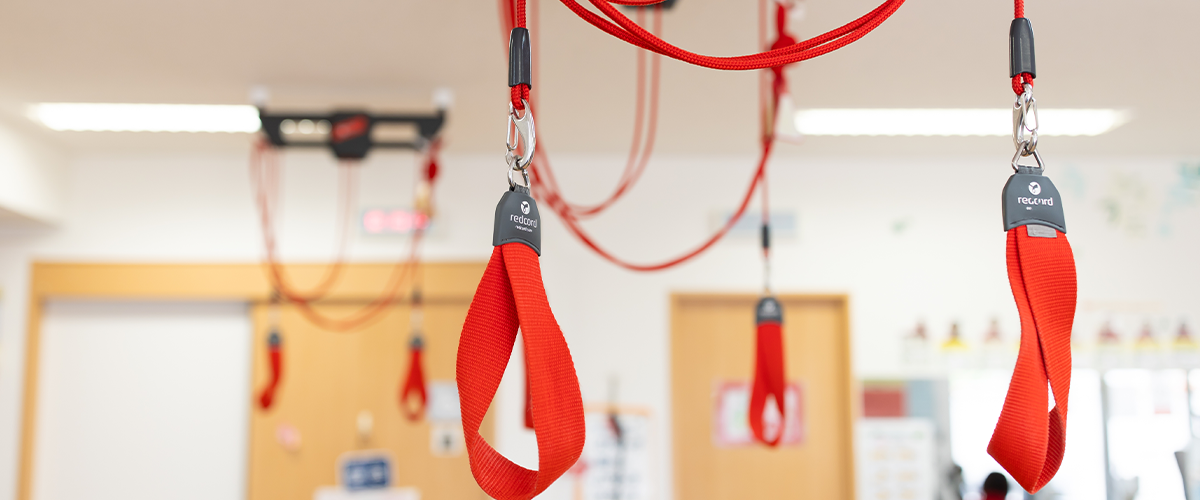 トータルリハセンターでは、天井からぶらさがる「二本の赤いひも(レッドコード)」を使ってバランス能力を高め、
