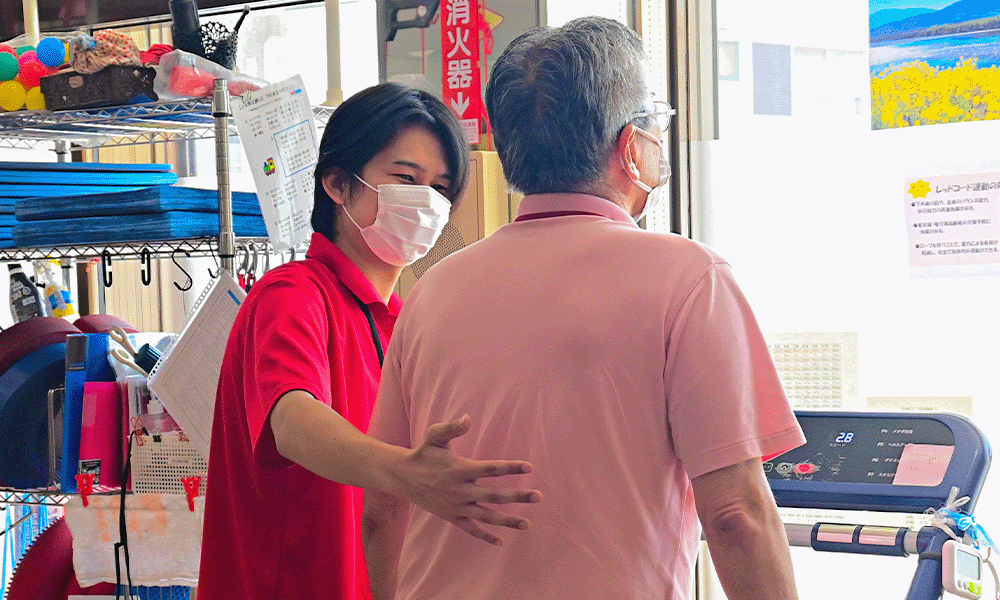 全体を通してとても活気があり、男性のご利用者さまも多く、センター内はいつも賑やかでフランクな雰囲気です。ご利用者さまの年齢層の中心は70〜80代ですが、最近では50〜60代の比較的若い世代の方も増えており、リハビリに対して意欲的な方が多く利用されています。